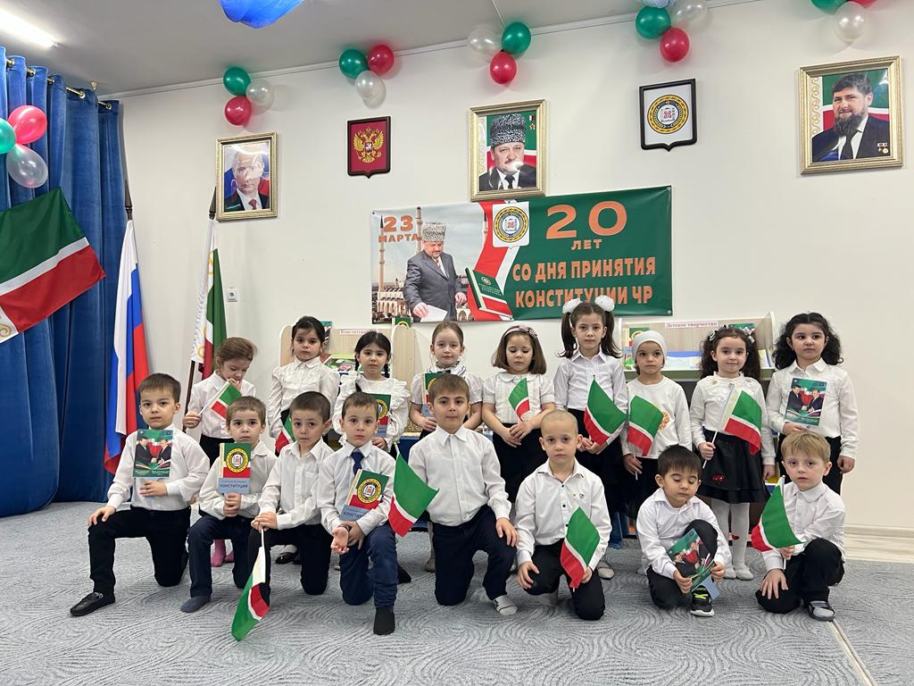 22.03.202323 марта празднуется важнейший праздник – День Конституции Чеченской Республики. Уже в дошкольном возрасте мы знакомим детей с основными положениями Конституции ЧР, воспитываем любовь, уважение и гордость к Родине, символам ЧР, прививаем начальные правовые знания, формируем правовую культуру посредством занятий и праздничных мероприятий. В рамках проведения мероприятий, посвящённых Конституции Чеченской Республики прошли следующие мероприятия: прошла выставка рисунков «Моя Чечня". В группах с целью формирования у детей представления о Конституции ЧР, символике Чеченской Республики, чувства патриотизма, гражданского сознания и гордости за свою страну воспитатели провели тематическую беседу «День Конституции ЧР». Далее дети рассказали о символах Чеченской Республики (Гимне, Флаге и Гербе), спели гимн Чеченской Республики, поговорили о первом президенте ЧР – Ахмат-Хаджи Кадырове.